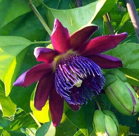 Passiflora alata 'Ruby Glow' (Passion Vine) - This South American vine explodes with blooms. Its flowers are huge - 5" across - an intense dark maroon, and give off an hypnotic nutmeg-musky scent. It has rounded , thick, leathery rich green leaves. 'Ruby Glow' can produce fruit if cross-pollinated. It loves the sun, but can take some shade, flourishing with average watering. It can frost down, but resprouts quickly. This plant has been grown for many years as Passiflora alata 'Ruby Glow' but more recently been identified as a species, Passiflora phoenicea, a close relative to P. alata that grows naturally in eastern Peru. Grows to 1-3 in container, vining in habit, minimun temperature indoors 50°, blooms in summer and fall.