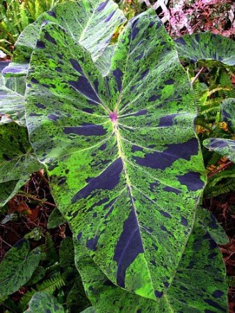 This beautiful colocasia speaks for itself. Incredible contrasting blacks and greens adorn its leaves. This camouflage effect is matched with light green stems streaked with dark purple that fade up to pink. What a great attention getter! The most spectacular Elephant's Ear yet! At 5-6 feet high and wide it's perfect in pots, spreading its graceful foliage over the border; or standing in solitary splendor in partly-shaded gardens. Interplant it with whites for a formal effect, or dress it up with bright green foliage plants and low-blooming flowers, it's great with lavender or pink! This plant has survived to Zone 7. The Mojito Elephants Ear also makes a great water plant along the edge of your pond! The Mojito Elephants Ear can also be grown year round indoors. Place it in a sunny window and set it in a saucer of water and it will be spectacular! Hardy in zones 7-10. In cooler regions it can be cut back and brought inside as a house plant in the winter. Proper name: Colocasia esculenta 'Mojito'